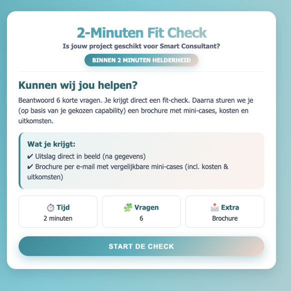 Beantwoord 6 korte vragen. Je krijgt direct een fit-check. Daarna sturen we je (op basis van je gekozen dienst) een brochure met mini-cases, kosten en uitkomsten.