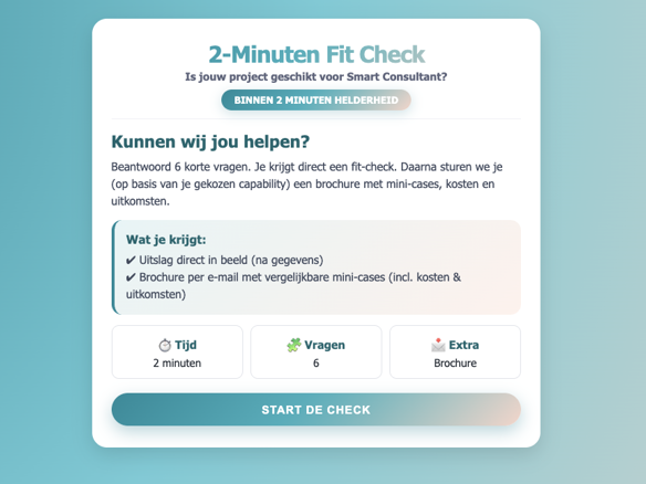 Beantwoord 6 korte vragen. Je krijgt direct een fit-check. Daarna sturen we je (op basis van je gekozen dienst) een brochure met mini-cases, kosten en uitkomsten.