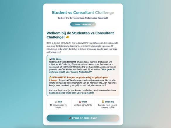 Onze student consultants scoren gemiddeld 75% op deze Back of the Envelope Case. Dat is een cognitieve capaciteitentest die veel wordt gebruikt bij assessments van topconsultancykantoren. De test meet vaardigheden zoals numeriek inzicht, analytisch denken en hoofdrekenen. Doe zelf de test en ontdek of jij het in je hebt om student consultant te worden! Oh ja — ChatGPT gebruiken heeft geen zin. Je maakt deze test volledig voor jezelf en de resultaten zijn niet zichtbaar voor degene die jouw sollicitatie beoordeelt.